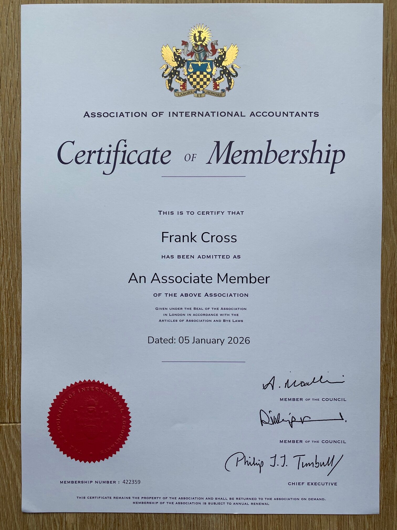 Náš partner Mgr. Frank Cross, MBA, nese titul AAIA – Associate of the Association of International Accountants – označující odborníka s mezinárodní účetní kvalifikací a zkušenostmi s přeshraničními transakcemi.